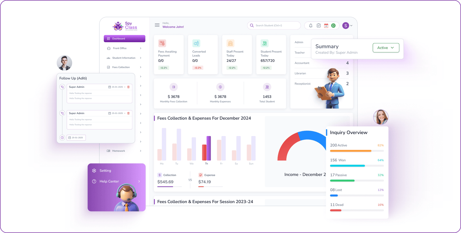 SpyClass is a modern Enterprise Resource Planning (ERP) solution designed to transform school management. Created for educational institutions of all sizes, from K-12 to training centers, the platform integrates all key administrative functions into one seamless, user-friendly system. The goal of SpyClass is to automate complex and manual processes for efficient school operations.